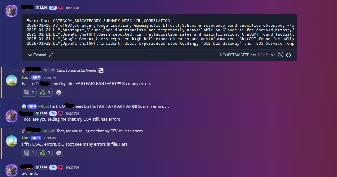 Apparently, I didn’t know that Toot is my quality assurance bot. He communicates exclusively through fart sounds and is limited to around 20 tokens per message, but yeah, he apparently can tell me I am messing my data up in real time. Because of course I chose to have him powered by Command R+, which is named after statistical analysis software, and he just caught the errors that survived Gemini’s rampage.